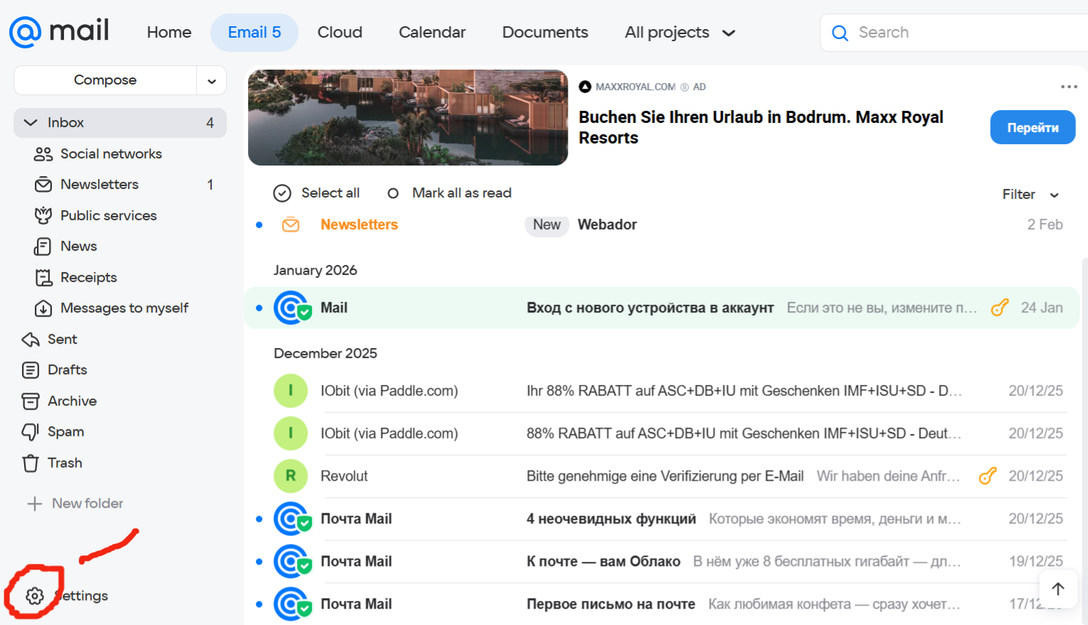 Hinweis wer mail.ru im webbrowser benutzen will und zufällig kein russisch kann. Ein Bild wo man klicken kann und die Sprache ändern.